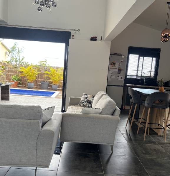 L’espace de vie s’ouvre sur une terrasse abritée par la pergola et sur la piscine, parfaite pour les moments de détente.